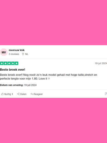 ''Beste broek ever! Nog nooit zo'n leuk model gehad met hoge taille, stretch en perfecte lengte voor mijn 1.80m. Love it''