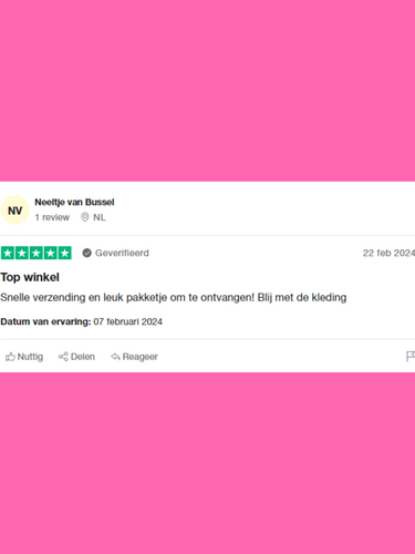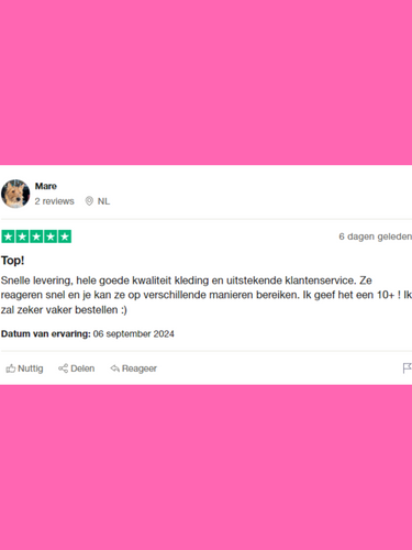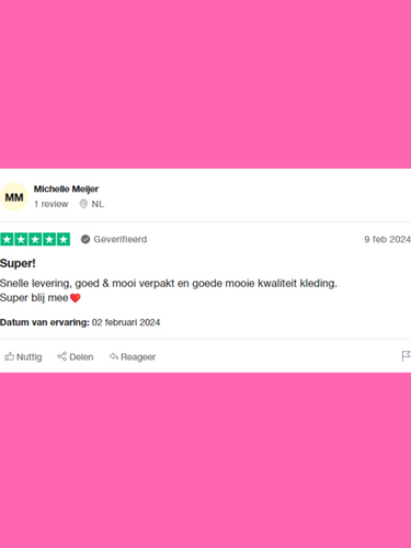 ''Snelle levering, goed & mooi verpakt en goede kwaliteit kleding. Super blij mee❤️''